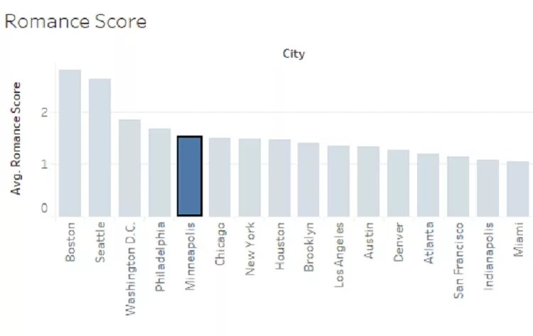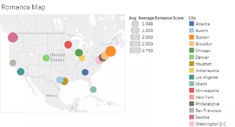 Items chosen include standard “I love you” items such as chocolate, strawberries, champagne, flowers, and candy. Based on this data, cities were given an average romance score, and the results were tallied.
