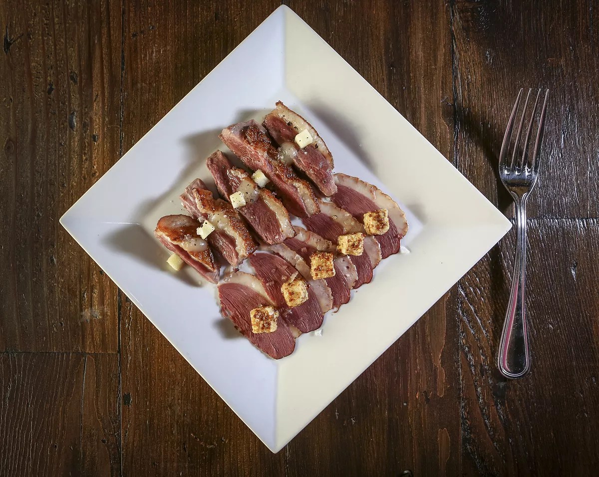 Other dishes, such as duck presented two ways, seem to lack any geographical anchor. For one presentation, the bird’s breast is salt-cured and then sliced paper-thin, resulting in intensely savory bursts of prosciutto flavor. Each bite should be taken with a cube of bread coated in honey mustard that provides an ingenious sweet-and-salty contrast. The same is found on the other half of the plate, where a fan of thick slices of roasted duck breast, supremely juicy after being basted in the bird’s own savory fat, rest with tender cubes of apple and
