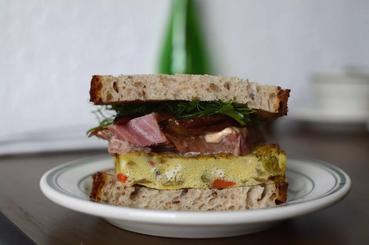 Yet the decision was made to instead build out the menu piece by piece. At the moment, each meal begins with a pickle plate littered with crisp brined cabbage, a plank of cucumber, and a toothsome wedge of green tomato that you’ll want to dice and scatter over every meal you eat henceforth. There are two iterations of corned beef: one in a breakfast sandwich ($14) that also contains a vegetable omelet flecked with onion and red pepper; you may instead request a fried egg. Fat ribboned slices of the cherry-hued beef are also the centerpiece of a simple sandwich ($16) smeared with the deli’s house-made, nose-tingling mustard.
