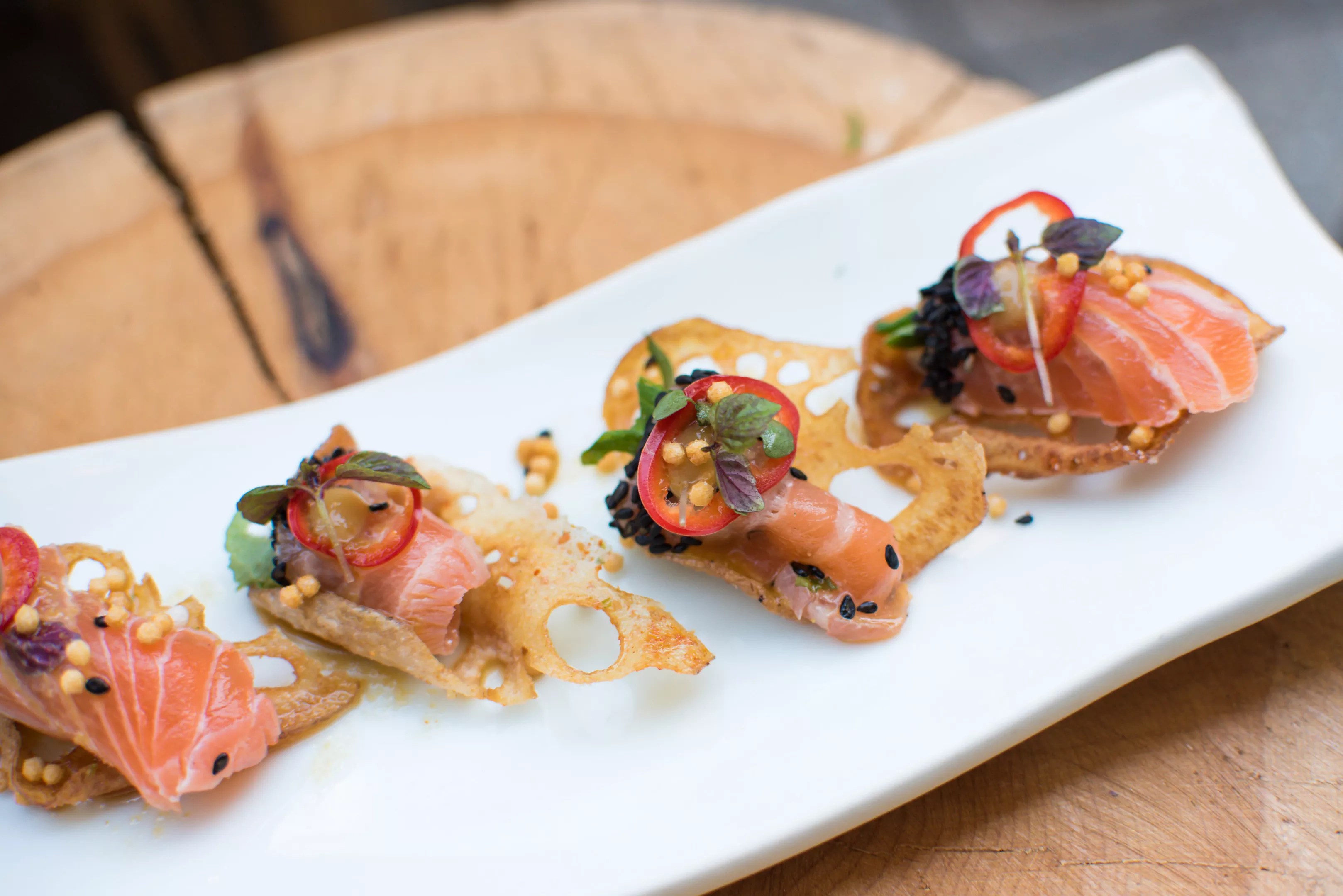 Filled with lush landscaping, flowers, and wooden furnishings, the Oshinobi bar highlights a Zuma bartender and an exclusive menu of champagne-based drinks only available there. As for food, there are spicy tuna hand rolls, black cod croquettes, and chicken yakitori skewers. Depending on the occasion, menus can be customized and inclusive of dessert items made by Zuma’s pastry chef.