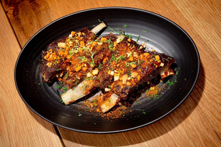 The menu at Glass & Vine eschews plate sizes and is split into four sections: Snacks, Garden, Sea, and Land. To start, opt for the barbecued spiced nuts that recently included cashews and walnuts tossed in a meringue spiked with garlic and onion powder, paprika, brown sugar, and complete seasoning. Left out to dry, the savory nibble takes on an ear-shattering crunch when eaten. Nearly all dishes arrive on black plates, which make for eye-popping and sometimes ominous presentations. Charred cauliflower is roasted and then fried until the florets take on a dark-chocolate tone. Chef Giorgio Rapicavoli isn’t hesitant to say it was inspired by a meal at Michael Solomonov’s Zahav in Philadelphia. The slick of tahini, along with crushed dried chickpeas and olives, makes a decent complement.