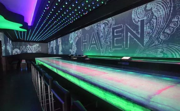 The snow-capped mountain range is dazzlingly white against an impossibly blue sky, and snowflakes slowly drift to the rhythm of the Tom Tom Club. The Tom Tom Club? Don’t ask questions; just go with the flow. The wraparound LCD walls might soon change to images of the Mediterranean. A thousand or so ice-cube lights running in rows on a black ceiling subtly switch hues. The Siberian white-onyx bar changes color too, and if you sit long enough, Haven Gastro-Lounge fills to the brim with an electric late-night South Beach crowd (the room stays plugged in daily till 5 in the morning). Cocktails, placed on our table by a young waitress in a skin-tight micro-skirt, emanate smoke from liquid nitrogen — also used to great visual effect in creating made-to-order ice creams for dessert. Among the drinks, desserts, and dramatics are a global mix of delectable small plates orchestrated by chef Todd Erickson. There are six categories of haute bar snacks: Crudo, Green, Roll, Crisp, Skewer, and Slider. Everything bursts with clean, fresh flavors, from a spicy tuna roll with crisp rice to coconut-crusted rock shrimp with wasabi-peach marmalade to a skewer of jerked chicken thighs atop a cucumber-pineapple salsa. Scintillating food in a stimulating psychedelic environment for the digital age. Cool.