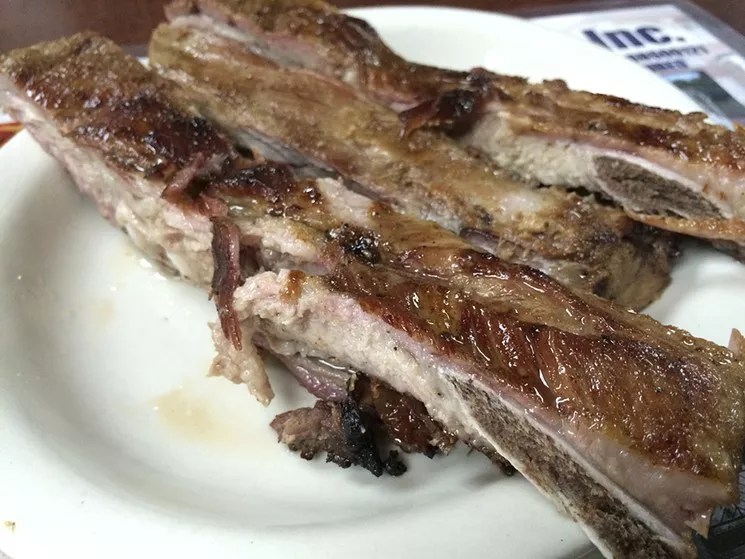 At Doral’s Las Mercedes Restaurant, the succulent, fat-rippled slabs served Thursday through Saturday speak for themselves. At most, there’s a dusting of salt and pepper, perhaps accompanied by a splash of mojo. Racks of beef and pork are pulled from a smoking vessel, then cleaved and served with two sides such as moros, maduros, or boiled plantains with garlic oil. The place is run by Denise Paredes, who handles the register with ease while making chitchat and directing mammoth platters of ribs across the tight orange space. She and her husband bought it about ten years ago, when the weekend barbecue was already a longstanding tradition. They’ve also added some of their own flair to the mostly working-class menu, including a piquant, savory goat stew called chilindr