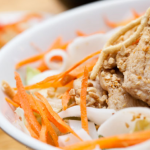 To assemble a main course, begin by choosing either chicken, beef, pork, shrimp, or tofu and vegetables. Cubes of red-tinted roast pork highlighted a fried rice that on a recent visit was barely fried and seemingly unseasoned – yet like the rest of Wok’s fare, it boasts a lightness and freshness not always inherent in Chinese food. Rectangular cuts of lean, tender beef match well with a gingery saut