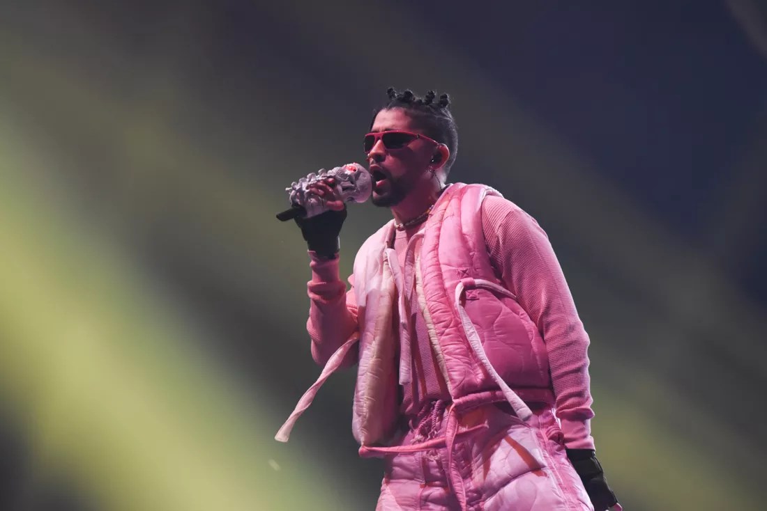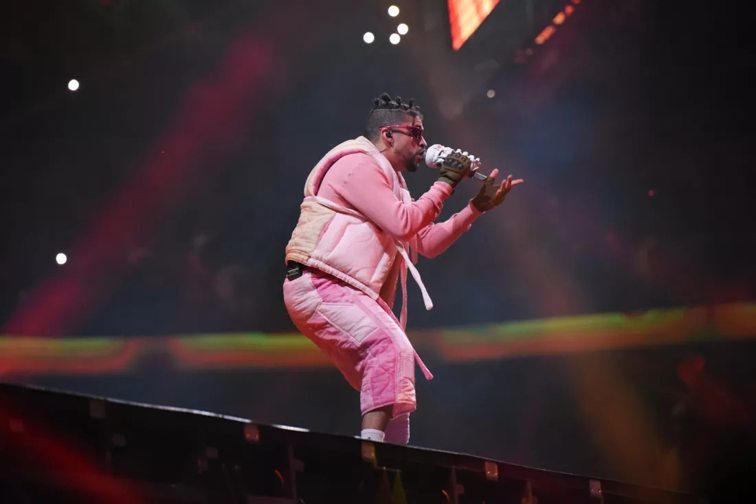 As the opening lines of “El Mundo Es Mío” played, the truck inched forward, and Bad Bunny, clad all in pink, ascended from the center of the flatbed with the drama of a gladiator in ancient Rome, split-stanced and straight-faced.