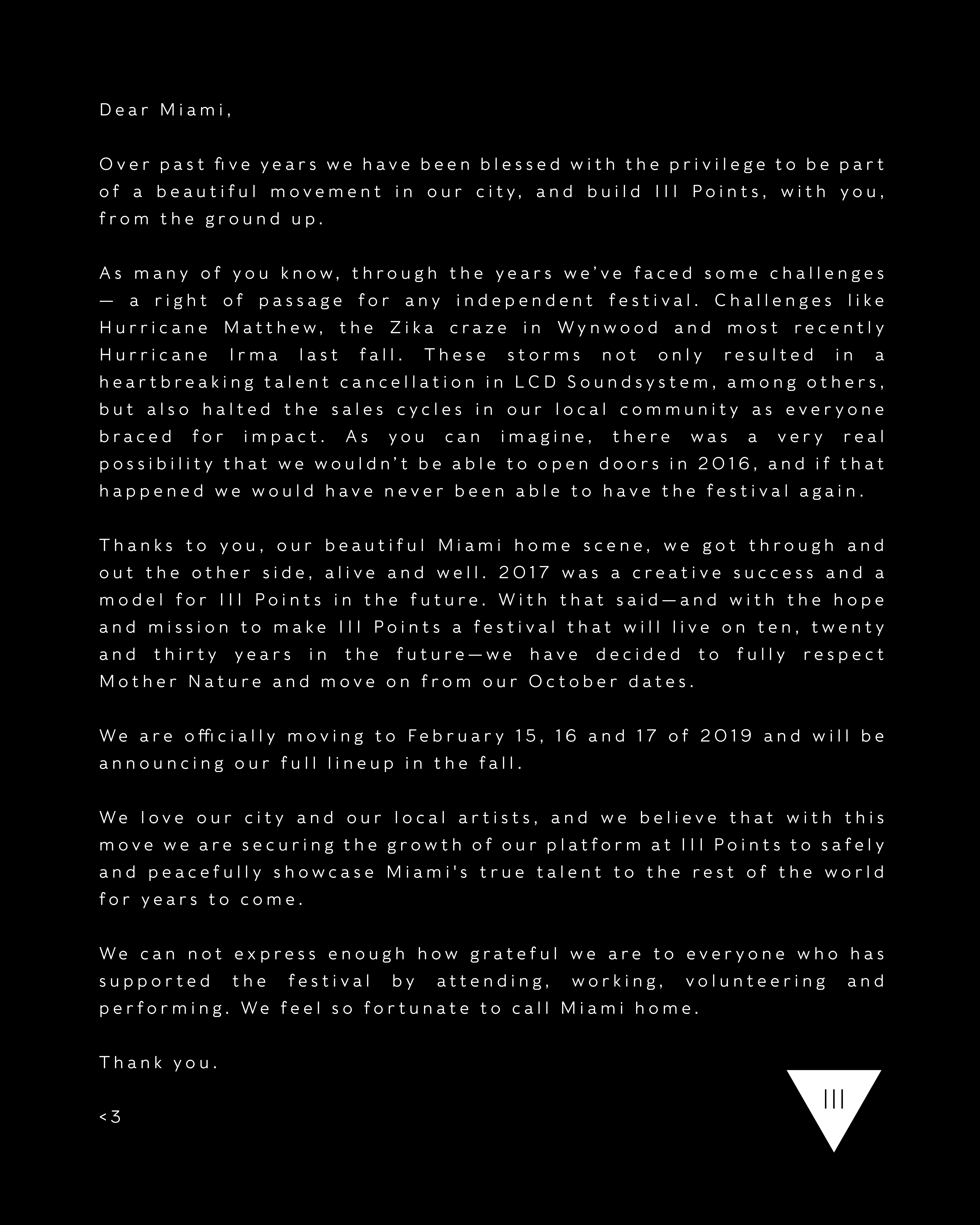 “As many of you know, through the years we’ve faced some challenges – a rite of passage for any independent festival,” the organizers wrote in a letter released today. “Challenges like Hurricane Matthew, the Zika craze in Wynwood and most recently, Hurricane Irma last fall. These storms not only resulted in a heartbreaking talent cancellation in LCD Soundsystem, among