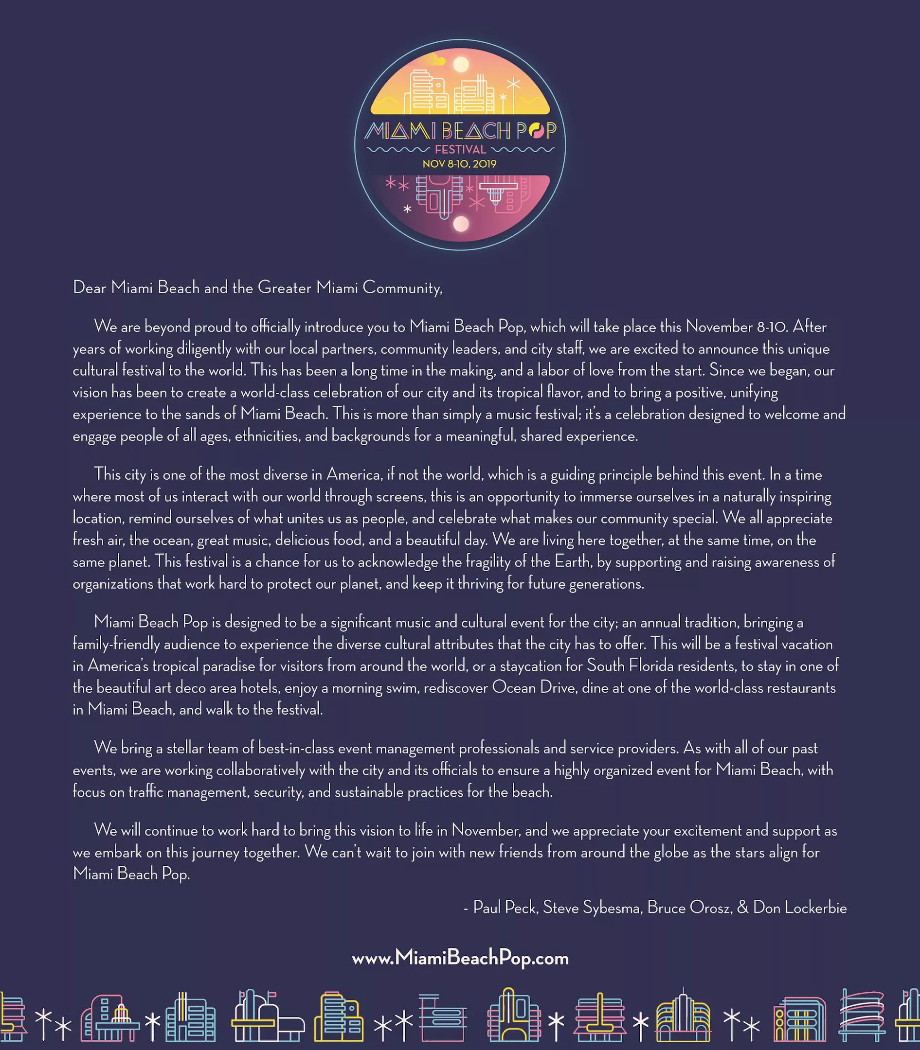 Still, Miami Beach Pop’s organizers seem to reassure residents they know what they’re doing. “We bring a stellar team of best-in-class event management professionals and service providers. As with all of our past events, we are working collaboratively with the city and its officials to ensure a highly organized event for Miami Beach, with focus on traffic management, security, and sustainable practices for the beach.”