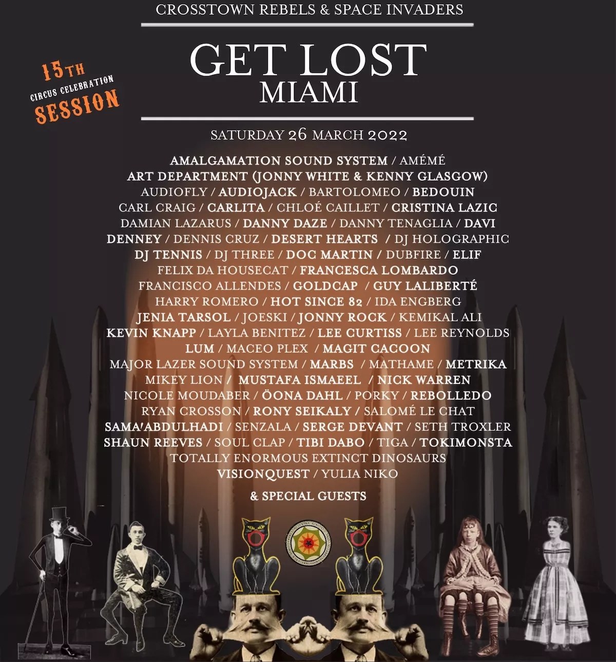 Get Lost Miami. 5 a.m. Saturday, March 26, at Factory Town, 4800 NW 37th Ave., Hialeah. Tickets cost $95.20 to $193 via dice.fm.