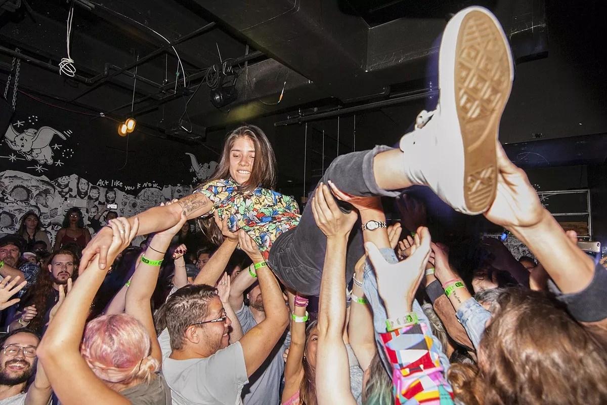 Marian Li Pino of La Luz crowdsurfs during the band’s show at Shirley’s.