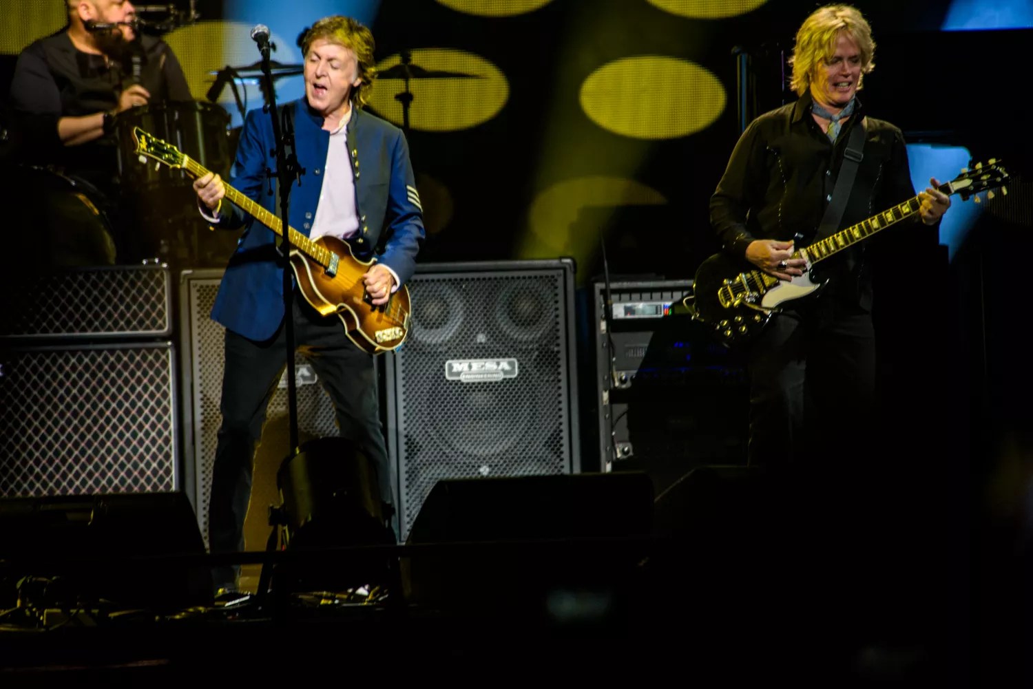 Complains aside, the rock star happily obliged his fans as he and his band ripped through a 33-song set – 38 with encore – that began with “A Hard Day’s Night” and ended with (what else?) “The End.” Cherry-picking his lengthy career for greatest hits and under-heard favorites, the show split the difference between “old songs, new songs and in-between song,” filling the gaps with stories from his time hanging with other rock icons. All 60-odd years of his career were represented, as he played both the first song ever recorded by the Beatles – “There was five of us at that time…it cost us five pounds, a pound each” – as well as his latest song, the Kanye West and Rihanna collab “FourFiveSeconds” (Ye and Riri, sadly, did not appear). He also took time to dedicate songs to the three other members of the Beatles – Ringo got “Birthday” in celebration of his 77th – producer George Martin, McCartney’s wife Nancy, and even the Rolling Stones. “This idea of a rivalry,” he said of the band, “it’s a fake thing. Fake news!”