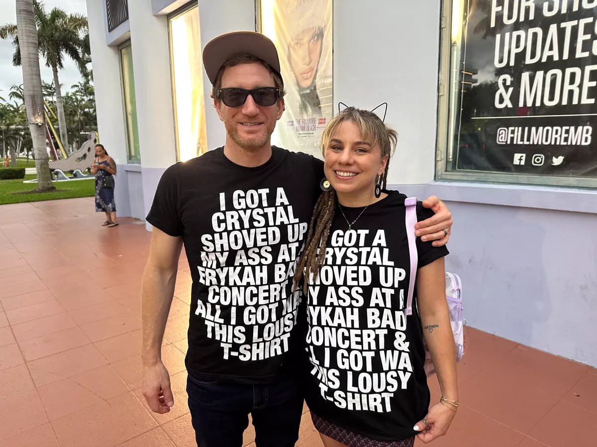 Two concertgoers wearing a limited edition t-shirt from a previous Badu show.