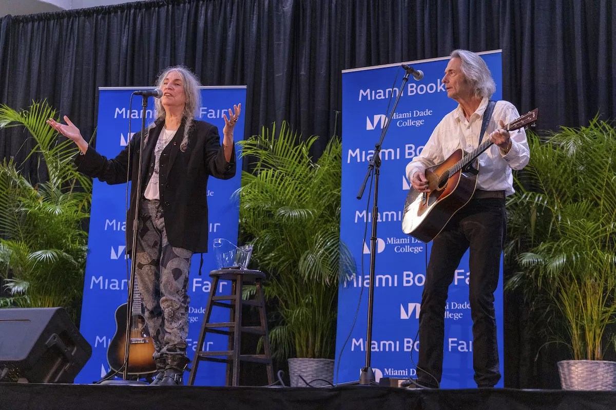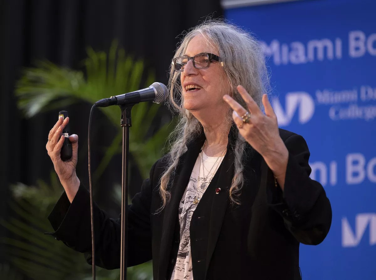 There’s a scene from an old Superman movie that pops up on social media from time to time where actor Christopher Reeve transforms from the nebbishy Clark Kent into the Man of Steel by merely straightening up his posture and taking off his spectacles. Last Friday at the Miami Book Fair, the legendary singer Patti Smith made a similar metamorphosis.