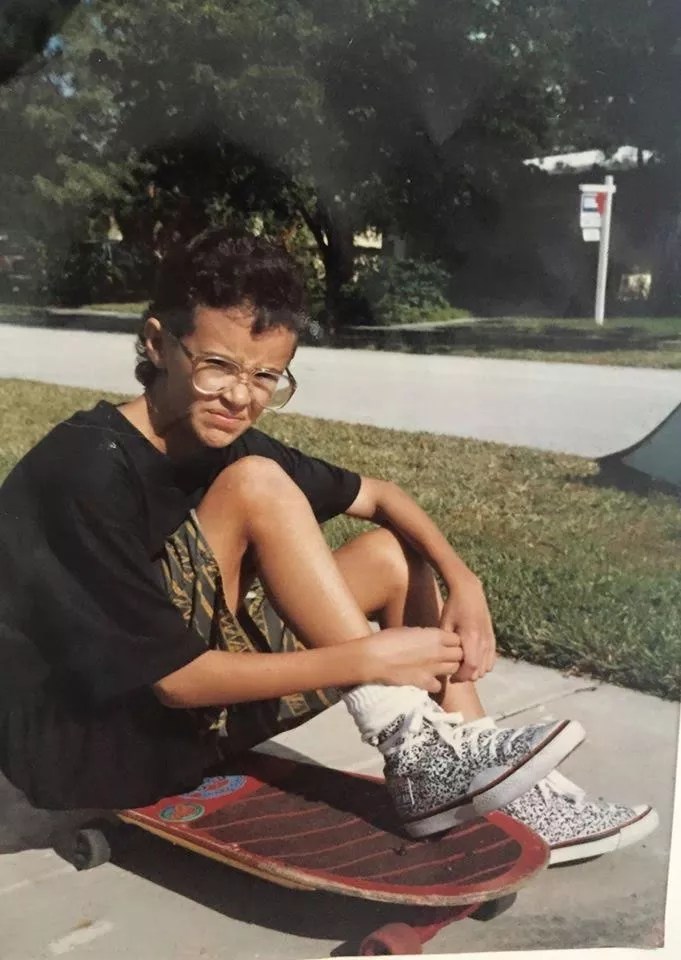A sixth-grade Kapel rests on his favorite skateboard, Billy Ruff.