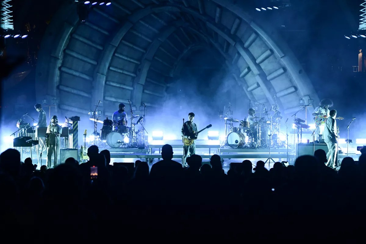 a band performing on an amphitheater stage under eerie, cloudy lighting