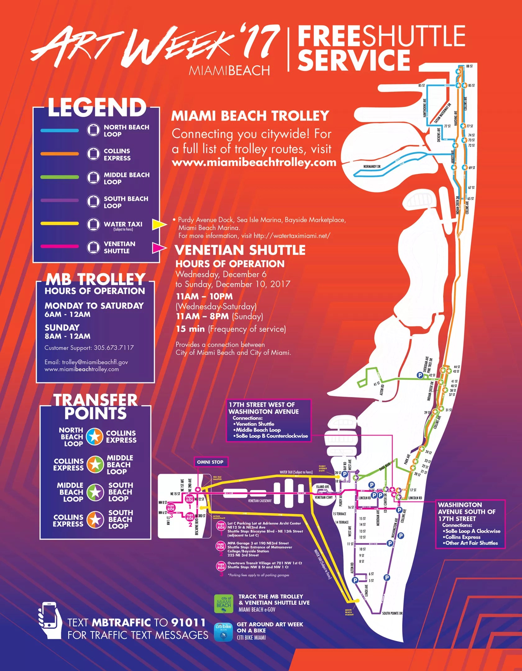 From there, you can connect to other shuttles running north/south along the barrier island, as well as the free Miami Beach trolley service: The Beach compiled a list of trolley stops located near the city’s various art fairs, which can be found here.
