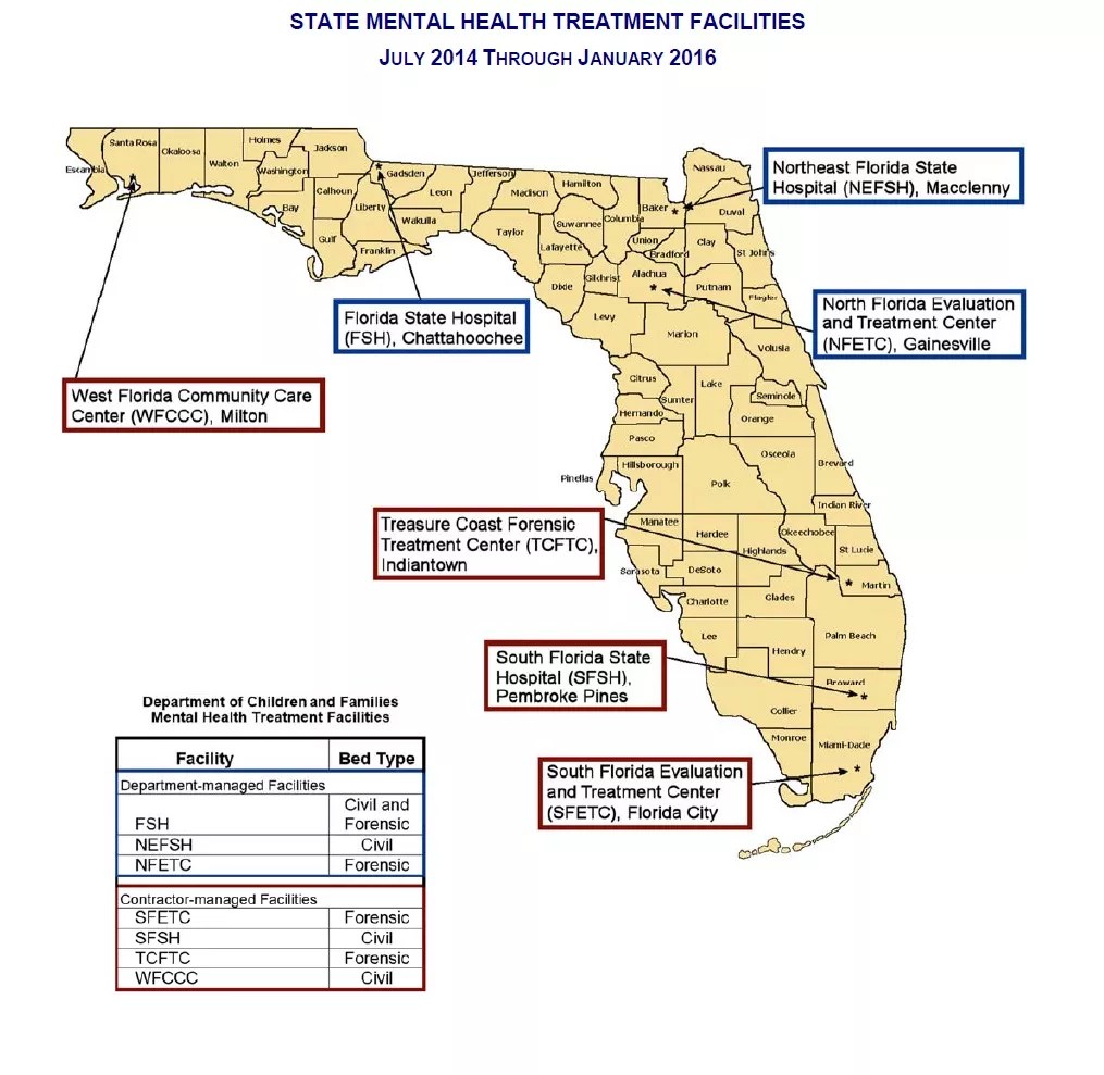 Each year, about 5,000 Floridians are sent to one of the state’s seven mental health facilities. Some have been committed under the Baker Act for evaluation and treatment. Others are defendants found too mentally incompetent for a trial or guilty by reason of insanity. A smaller number are sexually violent predators deemed too dangerous to roam the streets.