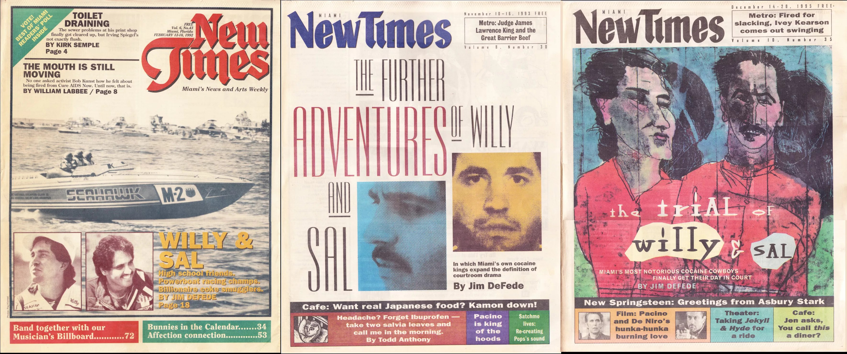 New Times covers that teased longform stories about infamous Cocaine Cowboys Willy Falcon and Sal Magluta, from February 1992, November 1993, and December 1995