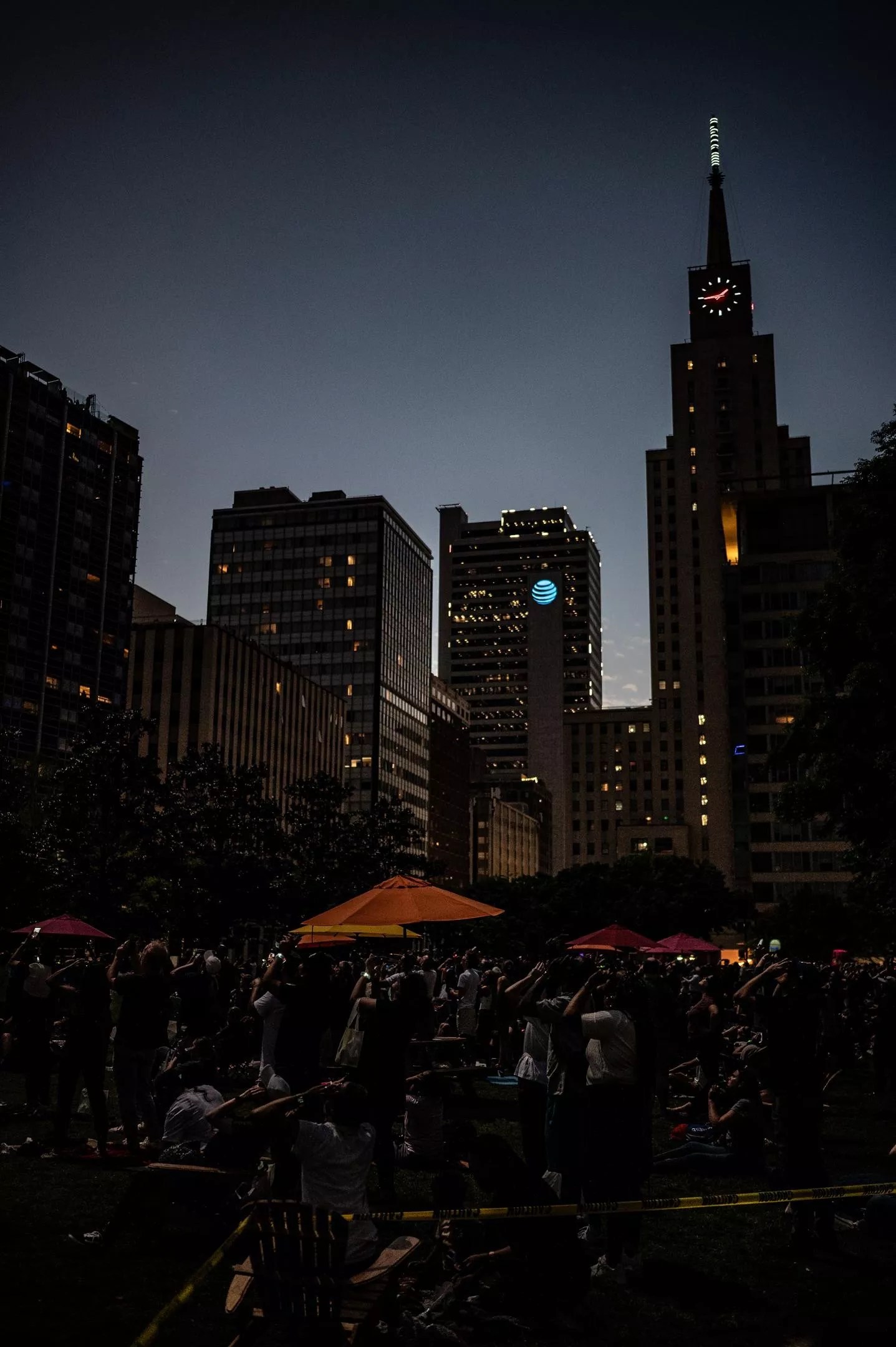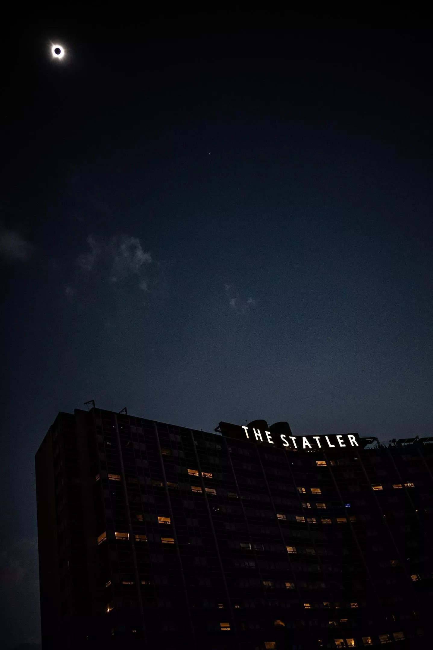 A view of the eclipse of the Statler Hotel during Downtown Dallas Inc.’s party at Main Street Garden.