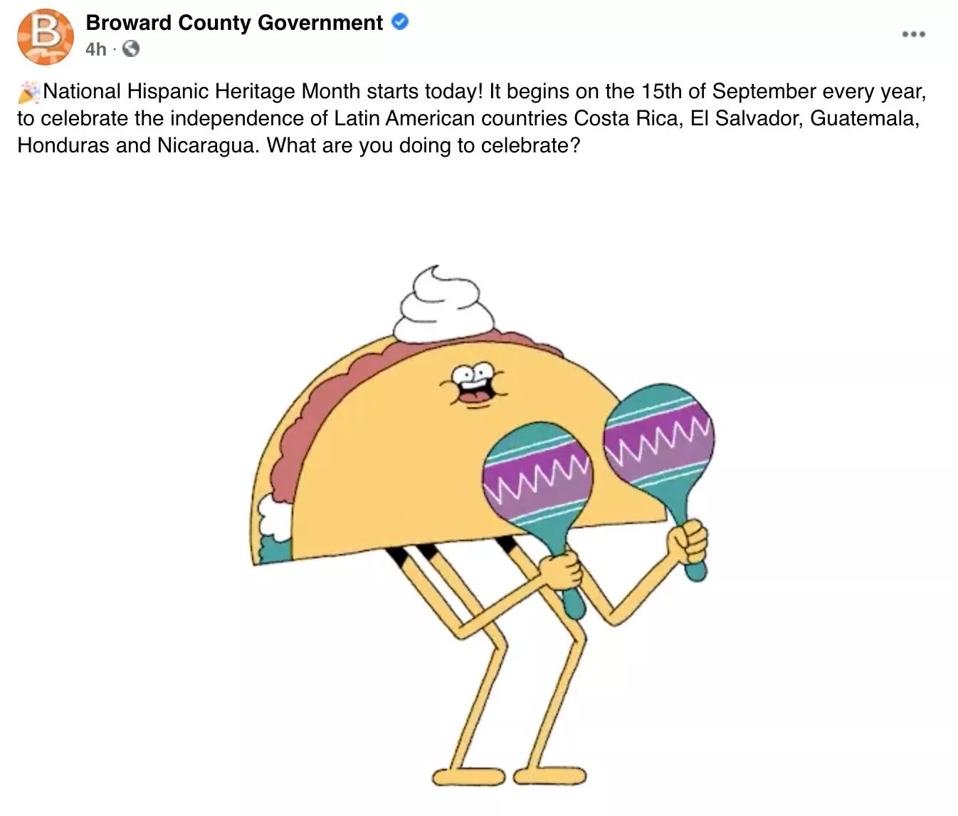 After being up for roughly four hours on Broward County Government’s official Facebook page, the post was taken down and replaced with a new post that stated the dates of National Hispanic Heritage Month (September 15 to October 15) that were a lot more tasteful despite the lack of a sour cream-topped taco wielding maracas.