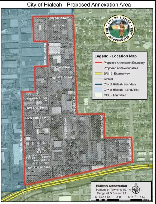 The Hialeah annexation proposal includes the area from NW 54th Street to the north; NW 37th Avenue to the west; NW 35th, 33rd, and 32nd avenues to the east; and State Road 112 to the south, according to a city report obtained by New Times. The initial annexation map was amended to exclude a church and a neighborhood of single-family homes near the eastern annexation boundary.