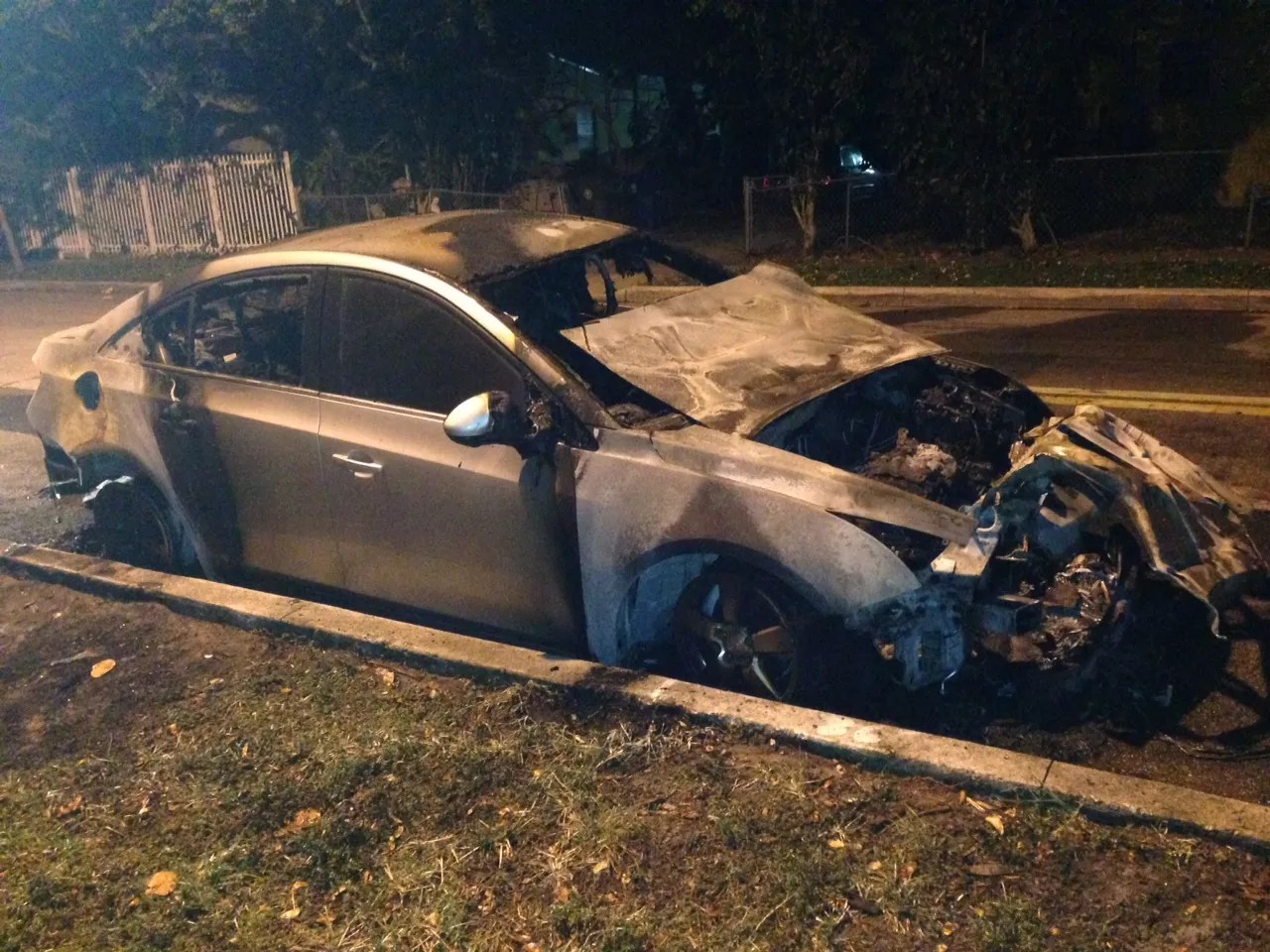 On Friday, Shockey – the former vice mayor of Miami Shores – says he was sleeping when he heard a commotion outside. He walked out his front door to see a group of cops and fire trucks outside his home. He turned a corner to see his 2014 Chevrolet Cruze engulfed in 20-foot-high flames. Fire was shooting from all four wheel wells, he says.