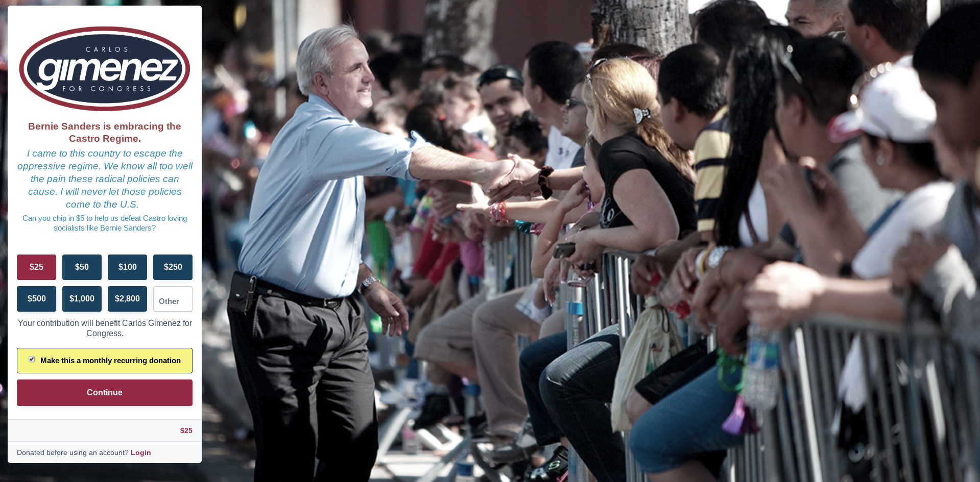 Within a week of those comments, the GOP online fundraising platform WinRed capitalized on the remarks for Gimenez’s campaign: “Can you chip in $5 to help us defeat Castro-loving socialists like Bernie Sanders?” The message was also sent in a text blast to constituents in Florida’s 26th Congressional District, which spans from South Miami-Dade to Key West.