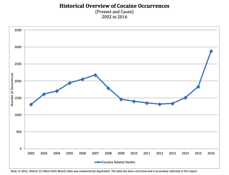 Back then, though, people were likelier to die in drug-related murders than overdoses in Miami-Dade County, which averaged about two cocaine deaths per month. These days, the overdose toll is much higher: Last year, an average of 36 cocaine users died per month, for a grand total of 439 cocaine-related deaths in 2016.