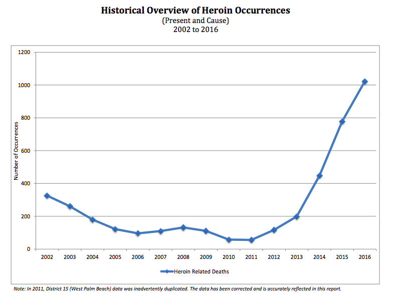 Miami-Dade accounted for more than 13 percent of those deaths. Heroin abuse, the natural progression of the state’s lingering opioid crisis, has become so prevalent that City of Miami commissioners have discussed suing pharmaceutical companies to recoup the costs of treating overdose patients.