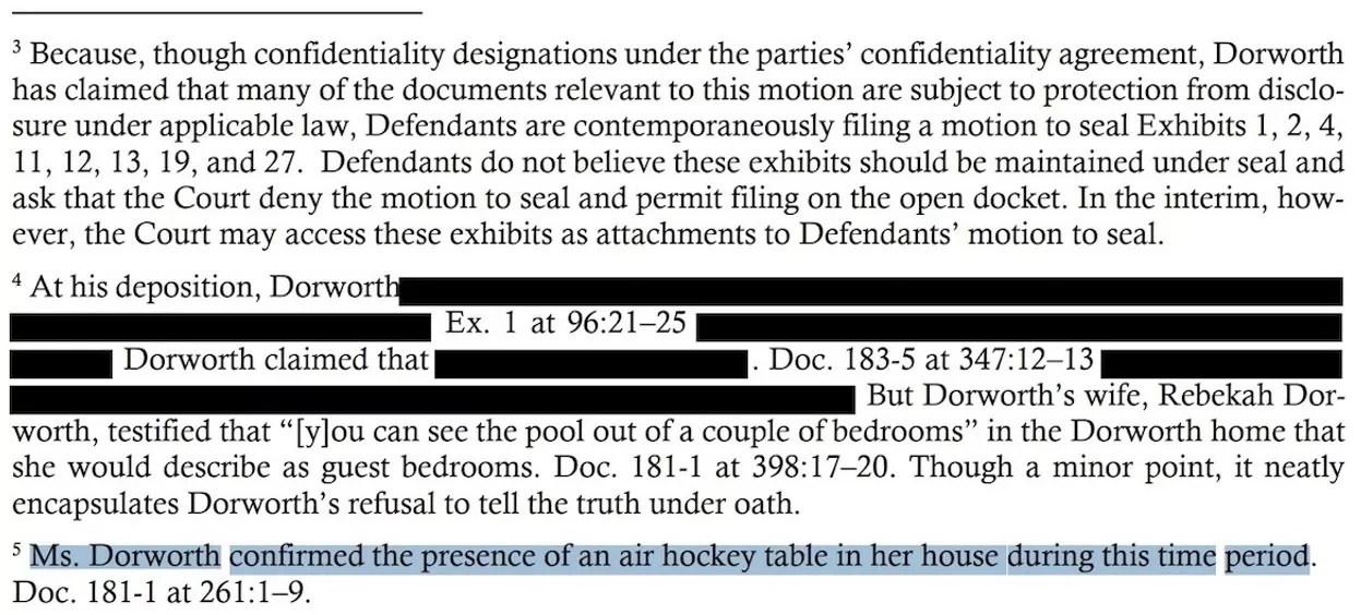 Another document describes the gathering as “one of multiple parties at Dorworth’s home that involved ‘alcohol; cocaine; middle-aged men; and young attractive females.’… This party sits at the heart of this case.”