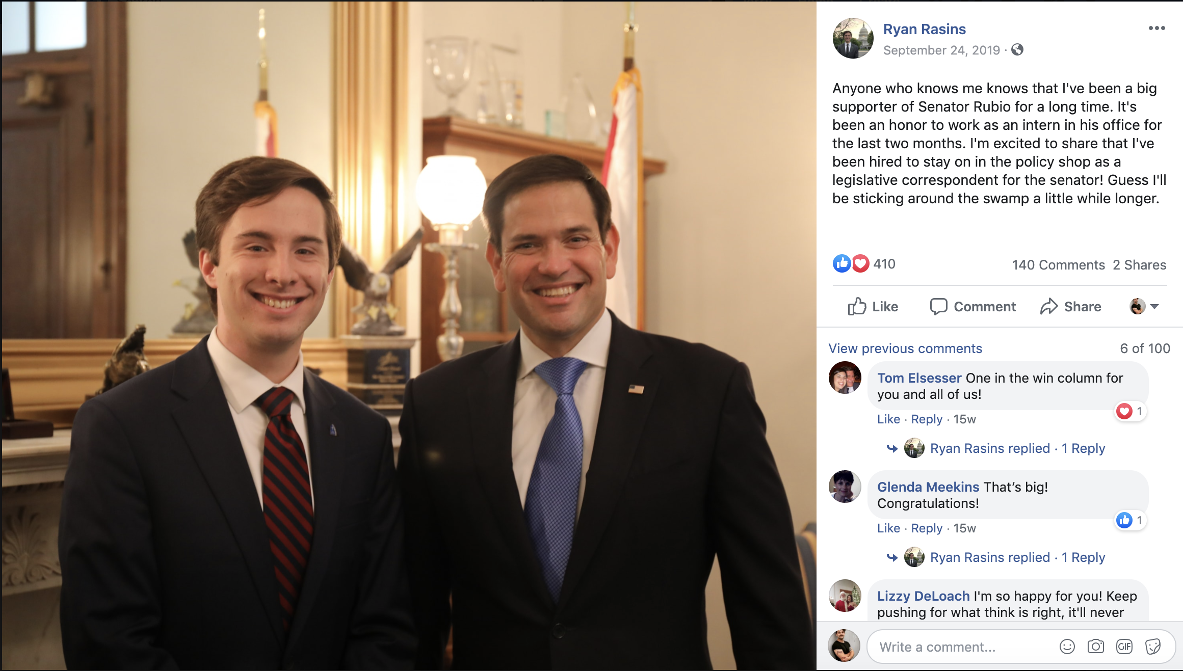The photo was posted on Twitter by a young Rubio staffer named Ryan Rasins. He says online he worked as an intern in Rubio’s D.C. office last summer before joining the team full-time in September. On LinkedIn, Rasins lists himself as a “legislative correspondent” in Rubio’s office.