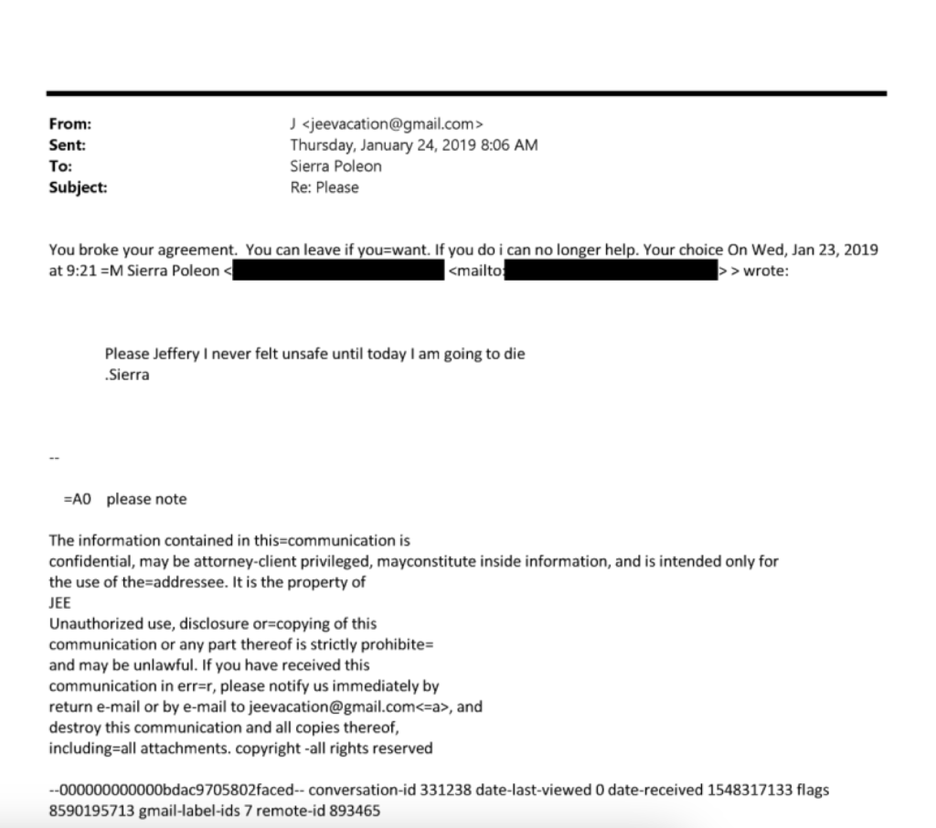 In a January 2019 email, six months before his July 2019 indictments for charges of sex trafficking of minors in Florida and New York, Sierra writes, “Please Jeffrey I never felt unsafe until today I am going to die. Sierra.”