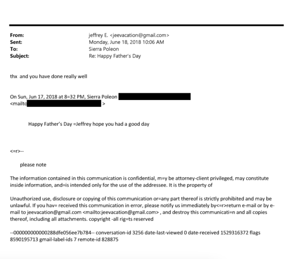 In a June 2018 email, Sierra writes, “Happy Father’s Day =Jeffrey hope you had a good day.”
