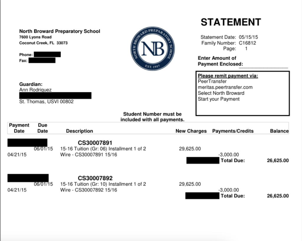 A statement from the school dated May 15, 2015, shows a $3,000 deposit for each student. The statement also shows a tuition fee of $26,625 for each student, marked as installment one of two. An email from Rodriguez to Epstein confirms he covered the $6,000 deposit for the girls.