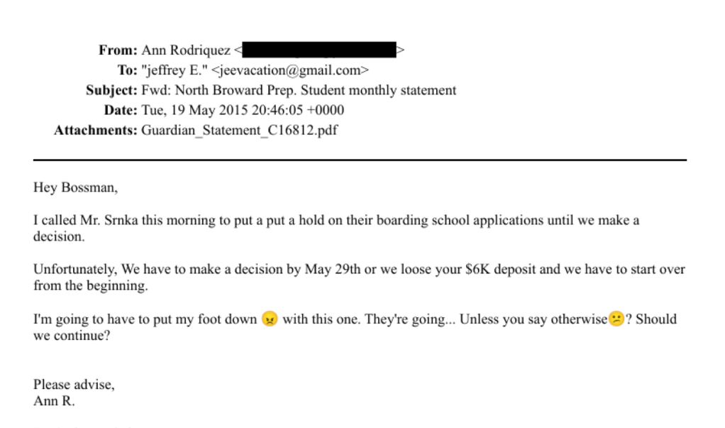 In a trove of emails from 2015, years after Epstein’s child prostitution conviction, Rodriguez chats with him about paying more than $50,000 in tuition for her daughters to attend North Broward Preparatory School in Coconut Creek (in the northern part of Broward County).