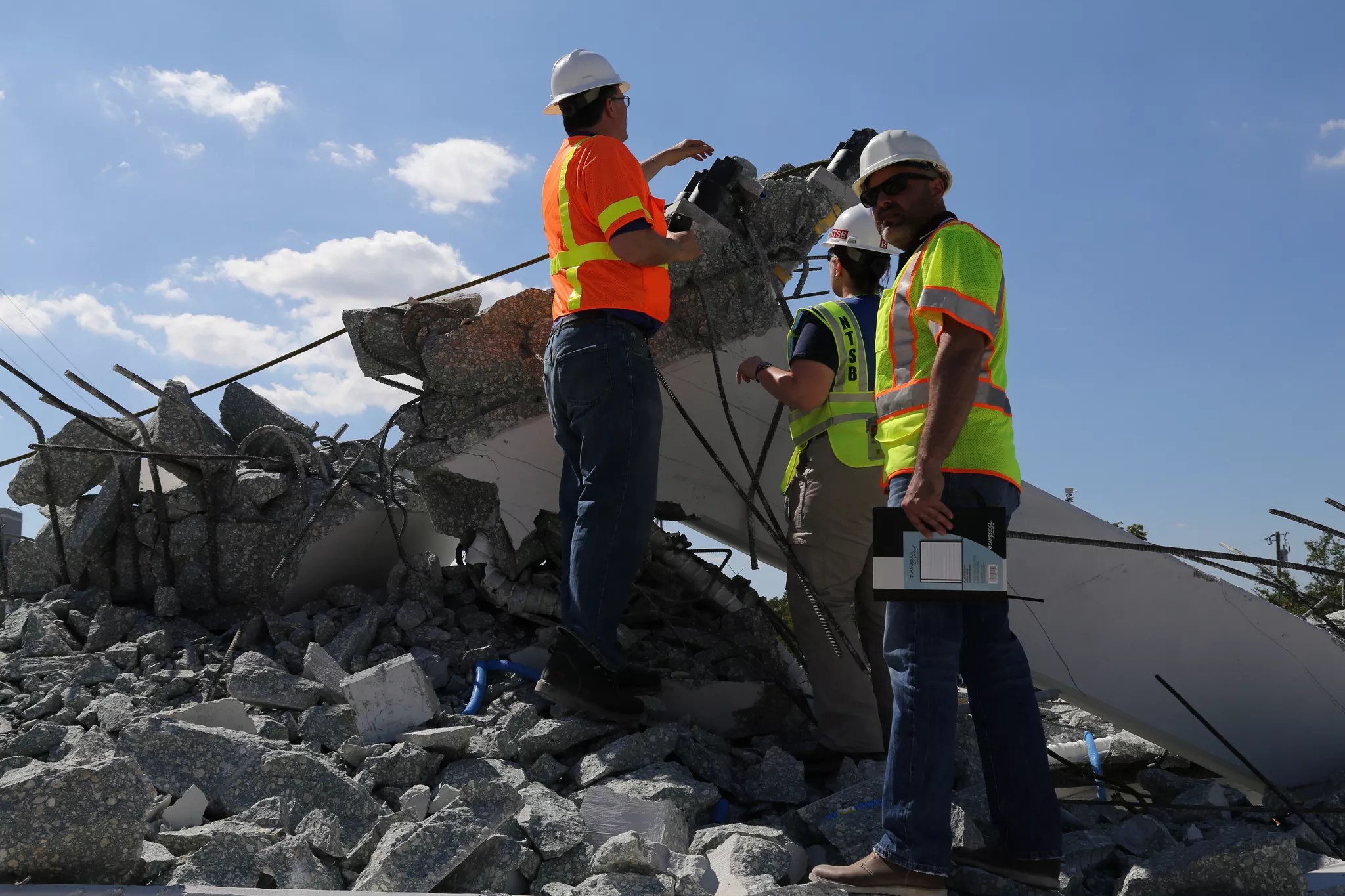 Federal investigators examine the debris from the collapse of a bridge on FIU
