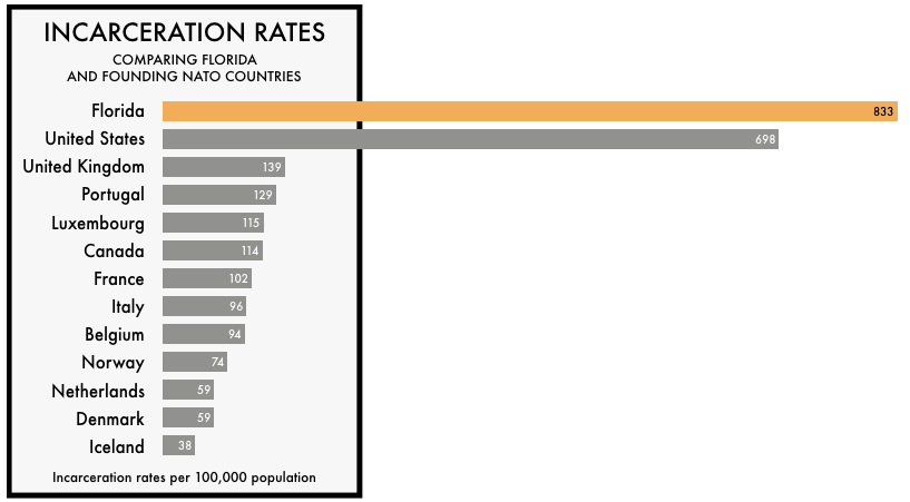 The next-highest country on the list, El Salvador, imprisons only 614 people for every 100,000. Cuba? Just 510 people. Russia? Only 413. Iran sits at 284. The (rightfully) criticized Nicaragua jails just 238. Venezuela, a country that Florida’s hardline Republicans really want to crack down on, imprisons only 173 people for every 100,000 residents.