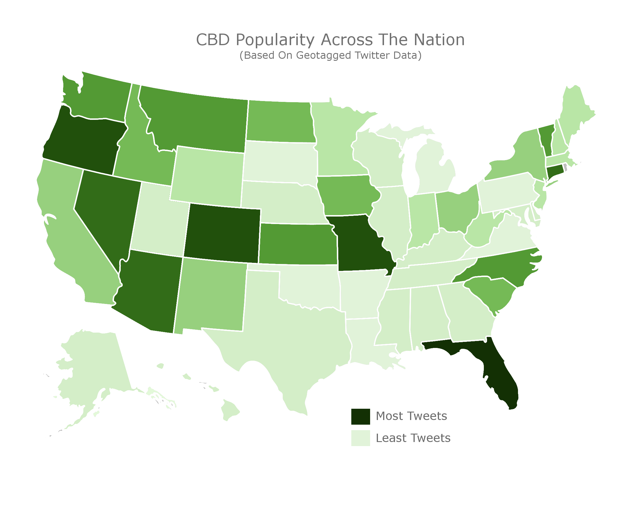 Florida was followed by Colorado, Oregon, Missouri, and Connecticut to round out the top five states making up the bulk of CBD-related tweets during July.