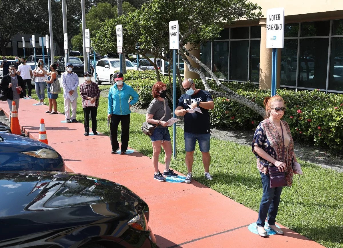 Voters wait in line to drop off their vote-by-mail ballots at Miami-Dade's election headquarters on October 14, 2020.