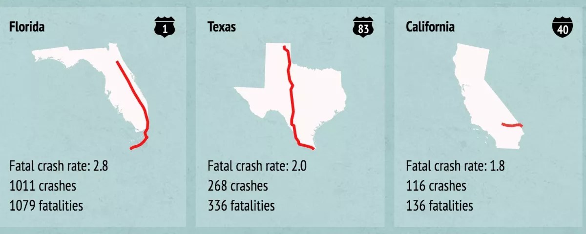 The firm calculated the total number of crashes, fatalities, and a “fatal crash rate” based on those figures — and by every measure, Florida’s long ribbon of U.S. 1 was the worst. Its fatal crash rate easily eclipsed Geotab’s second-place highway, Texas’ U.S. 83; and the third deadliest road, a short stretch of I-40 in California.