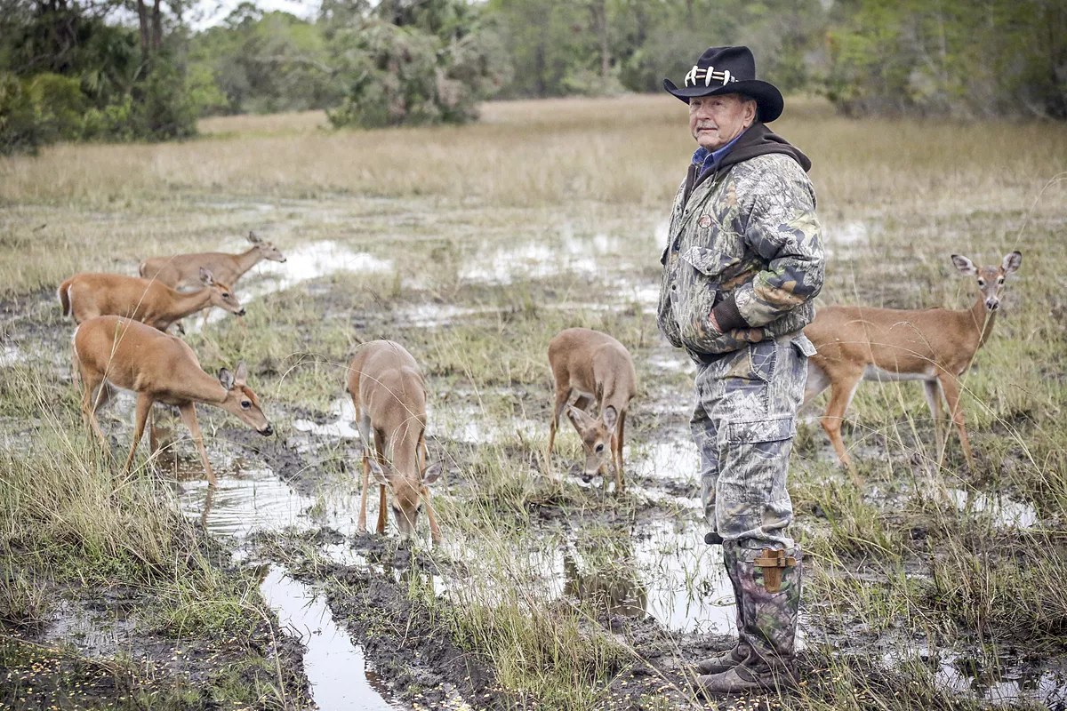 Dressed in head-to-toe camouflage, Ron Bergeron emerges from a yellow thicket and gazes at the open pasture. A heavy rainstorm has left behind a field of black mud and wet grass in Big Cypress National Preserve. The sky is gray and the land bare, save for a herd of deer grazing in the brush a mile away.