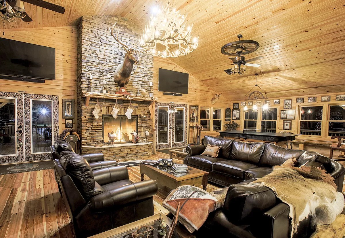 A chandelier of tangled deer antlers casts an orange glow across the main lodge inside Bergeron’s Green Glades West resort in Big Cypress National Preserve. The light flickers off the fur of the taxidermy displays, bringing to life a stuffed wild hog, a black bear, a bobcat, and an otter, propped above the bar.