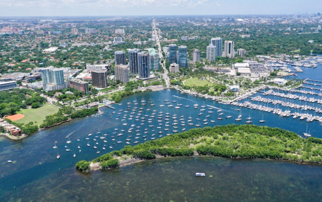 A drone’s-eye view of Fisher Island with Miami Beach in the background