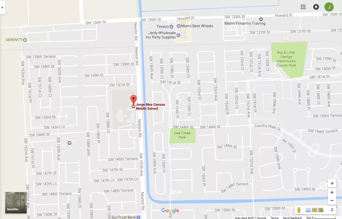 The only thing more astounding than the clip might be what happened next: A group of Redditors used Google Maps to pinpoint the location where the footage was taken. Naturally, it was Miami-Dade. The clip was filmed directly across the street from Jorge Mas Canosa Middle School on Newton Road in far Southwest Miami-Dade County.