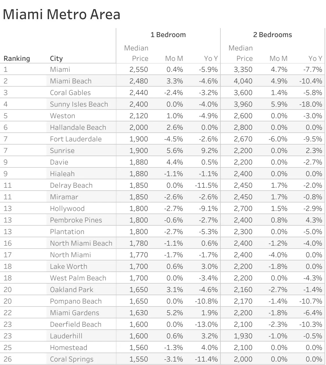 The real estate platform also analyzed active real estate listings across South Florida, and, as expected, Miami ranked as the most expensive city. The one-bedroom median rent in Florida for the month of March was $1,605, and only four of the 26 cities included in the report fell below the median rent: Coral Springs, Homestead, Lauderhill, and Deerfield Beach.
