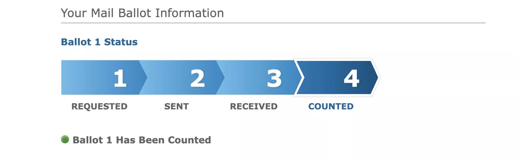 The voter information tool allows you to see the status of your ballot from requested to sent, received, and counted. The screenshot above shows what you’ll see if everything went as planned.