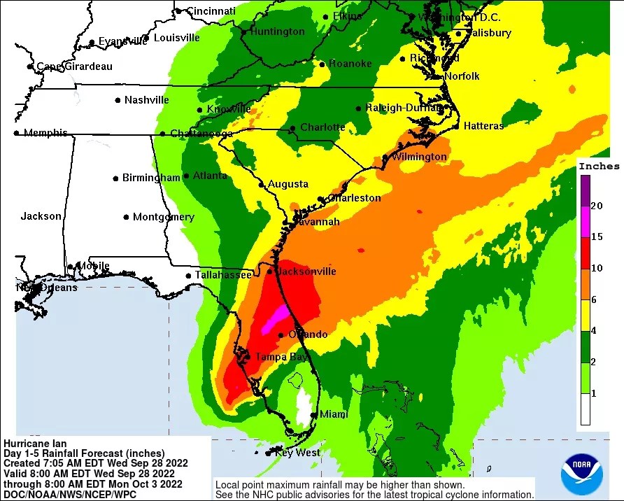 The NHC estimates that the Florida Keys and South Florida will be inundated with 6 to 8 inches of rain from Ian, with isolated totals exceeding 12 inches. Central and northeast Florida will receive 12 to 18 inches of rain, with some areas exceeding 24 inches.