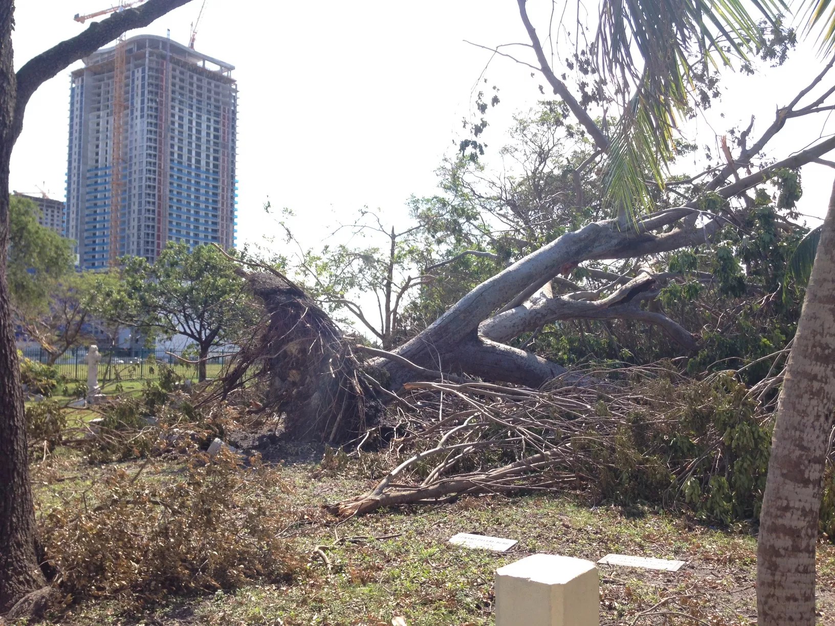 Outside the Miami City Cemetery, tree limbs crowd the narrow sidewalk and a padlock secures the gated entryways. At the east end of the graveyard, dozens of tropical trees – some planted nearly 100 years ago – have toppled onto tombstones.