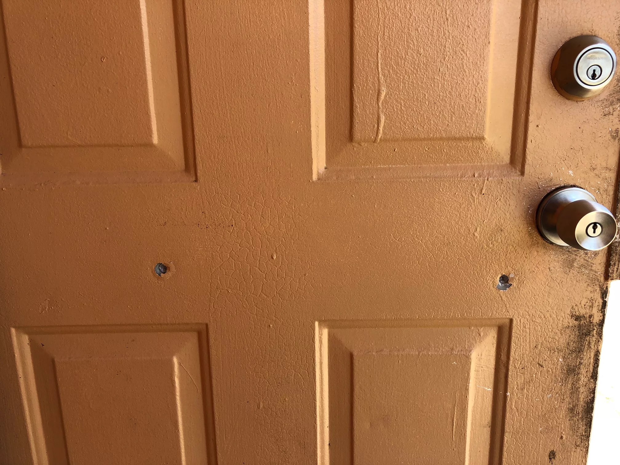 A crime scene photo from the shooting of Juvon Simon shows two bullet holes through the apartment door.