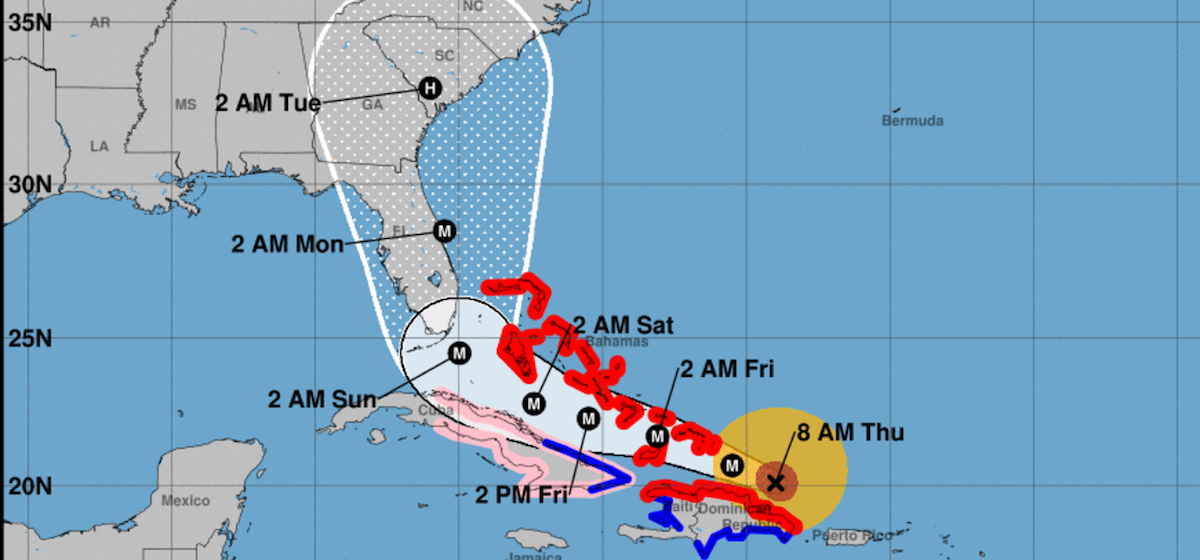 As of 8 a.m., NOAA’s official hurricane warnings are limited to parts of the Dominican Republic, Haiti, and the Bahamas, and only eastern Cuba is under a hurricane watch. But a watch – which means tropical storm conditions are likely within 48 hours – is headed to Miami very soon.
