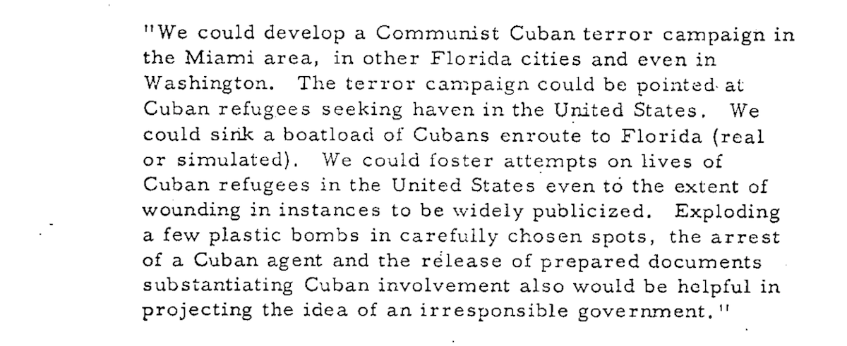 Just to reiterate how crazy this idea is: The CIA thought about blowing stuff up in Florida and murdering innocent refugees simply to make Castro look bad.